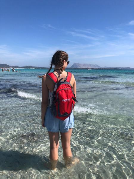 Gina bewacht Rucksack mit Futter im Süden von Kroatien