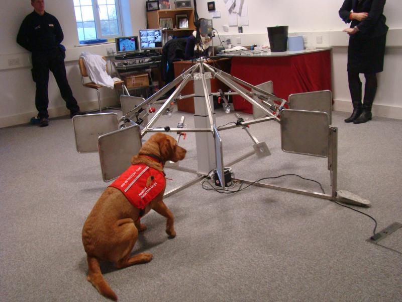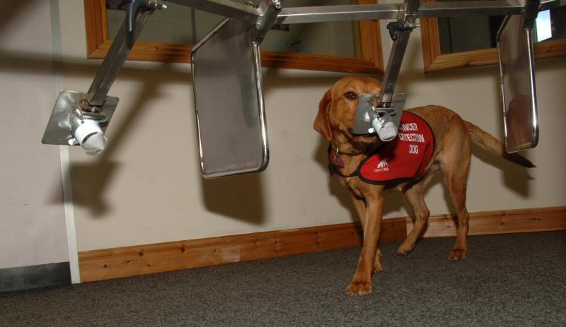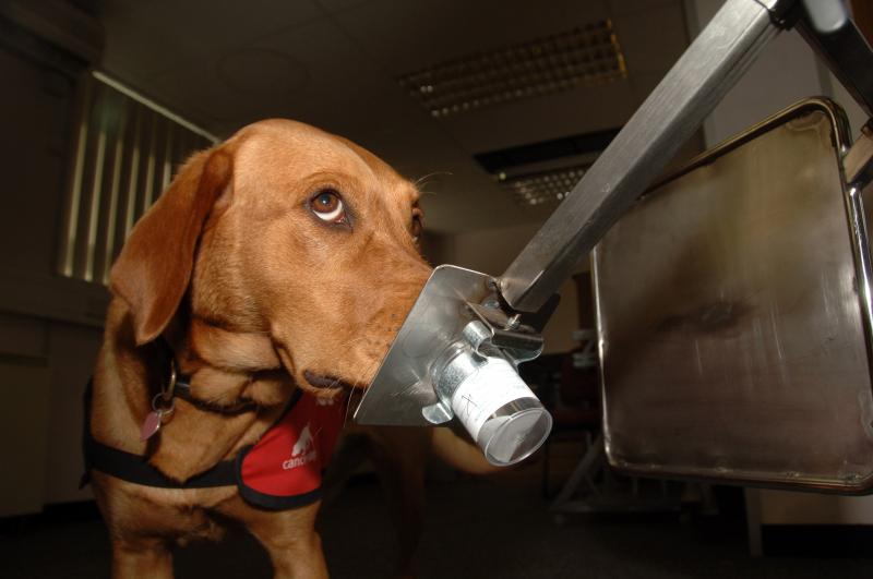 Es wedelt nicht nur der Schwanz, sondern fast der ganze Hund: Daisy kann es kaum erwarten, zur Arbeit zu gehen. Der honigbraune Labrador trägt eine rote Schabracke mit der Aufschrift «Bio Detection Dog», also Bio-Spürhund. Und das ist auch Daisys Aufgabe, denn sie ist ausgebildeter Krebsschnüffelhund. Mit ihrer Halterin, der Claire Guest betritt sie den Testraum, in dem ein futuristisches Karussell aus Chromstahl aufgebaut ist. Rings um das Karussell sind mit Klammern acht Plastikdöschen befestigt, in jedem ein bisschen Fliesspapier, das mit einigen Tropfen Urin getränkt ist. Dieser stammt von Patienten mit verschiedenen Erkrankungen von Niere oder Blase, aber nur eine einzige Urinprobe von einem Patienten mit Nierenkrebs ist darunter. Claire schickt Daisy los, sie geht zügig um das Karussell herum, schnuppert fast nachlässig an den Döschen und setzt sich dann kurzentschlossen vor eines hin. Es ist die Urinprobe des Nierenkrebspatienten. Claire betätigt den Clicker, einen kleinen Knallfrosch, und für Daisy heisst das «Gut gemacht!». Die Hündin geht zu ihrer Halterin zurück, setzt sich erwartungsvoll hin und bekommt einen Hundekeks zur Belohnung.