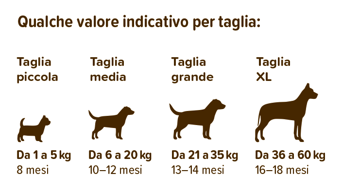 Più il caneè di taglia piccola, più rapidamente cresce e si può passare all’alimentazione per adulti.