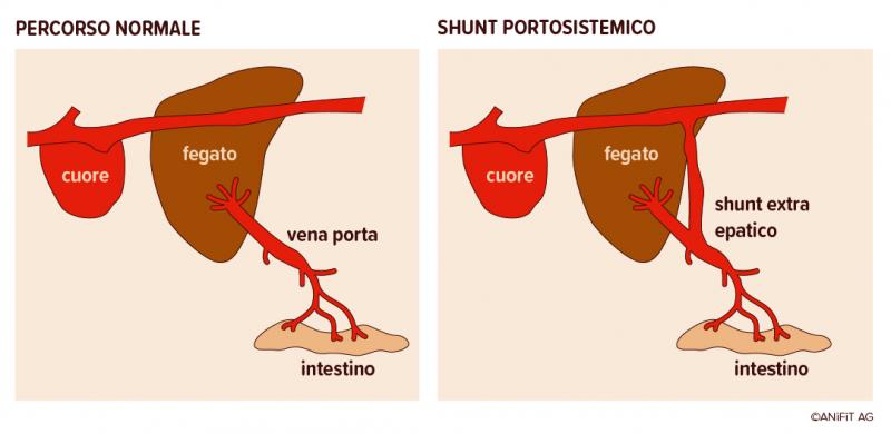 Lo shunt epatico è una malformazione dei vasi sanguigni che fa sì che il sangue proveniente dagli organi addominali non fluisca attraverso il fegato in modo normale. C'è, per così dire, un «cortocircuito» - uno shunt - tra i vasi sanguigni, e il fegato viene oltretrapassato. Così, il sangue non viene pulito e disintossicato nel fegato, ma viene distribuito dal cuore in tutto l'organismo. Le sostanze che in realtà dovrebbero essere escrete rimangono nel corpo. L'organismo si avvelena internamente.