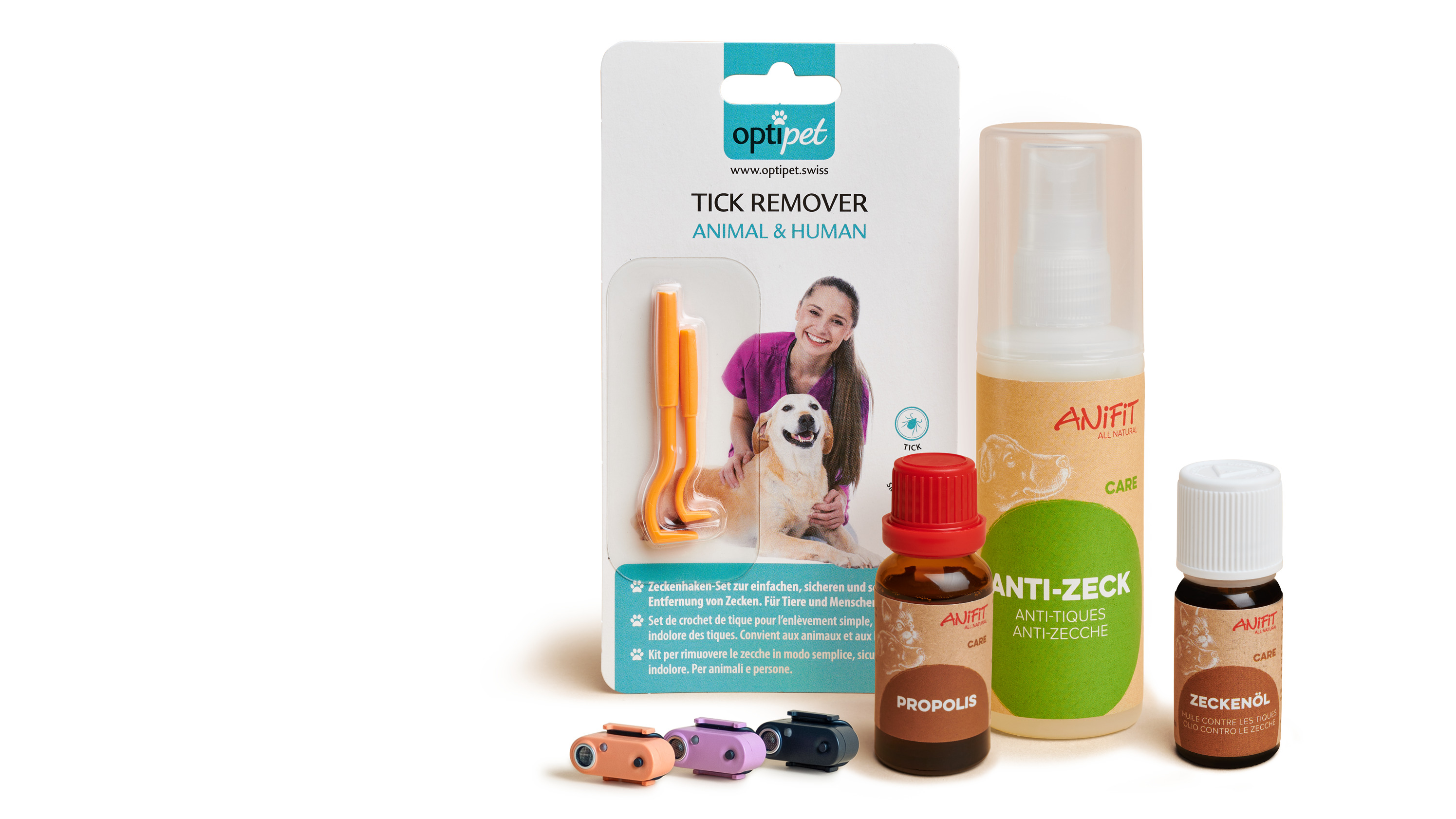 ANiFiT bietet verschiedene, natürliche Mittel zum Schutz vor Zecken an: Das Zeckenöl für Hunde und Katzen wird äusserlich aufgetragen. Die Inhaltsstoffe dringen in den Organismus ein und wirken dann von innen heraus. Es muss anfangs regelmässig aufgetragen werden und entfaltet dann eine Wirkung, die mehrere Wochen anhält. Der Zeckenspray für Hunde wird äusserlich vor jedem Spaziergang angewendet. Die wiederaufladbaren Tickless-Anhänger für Hunde und Katzen senden Ultraschallimpulse aus, die die Zecken fernhalten. Sollte dennoch eine Zecke zustechen, hilft der Zeckenhaken beim sicheren Entfernen und Propolis pflegt die betroffene Stelle.